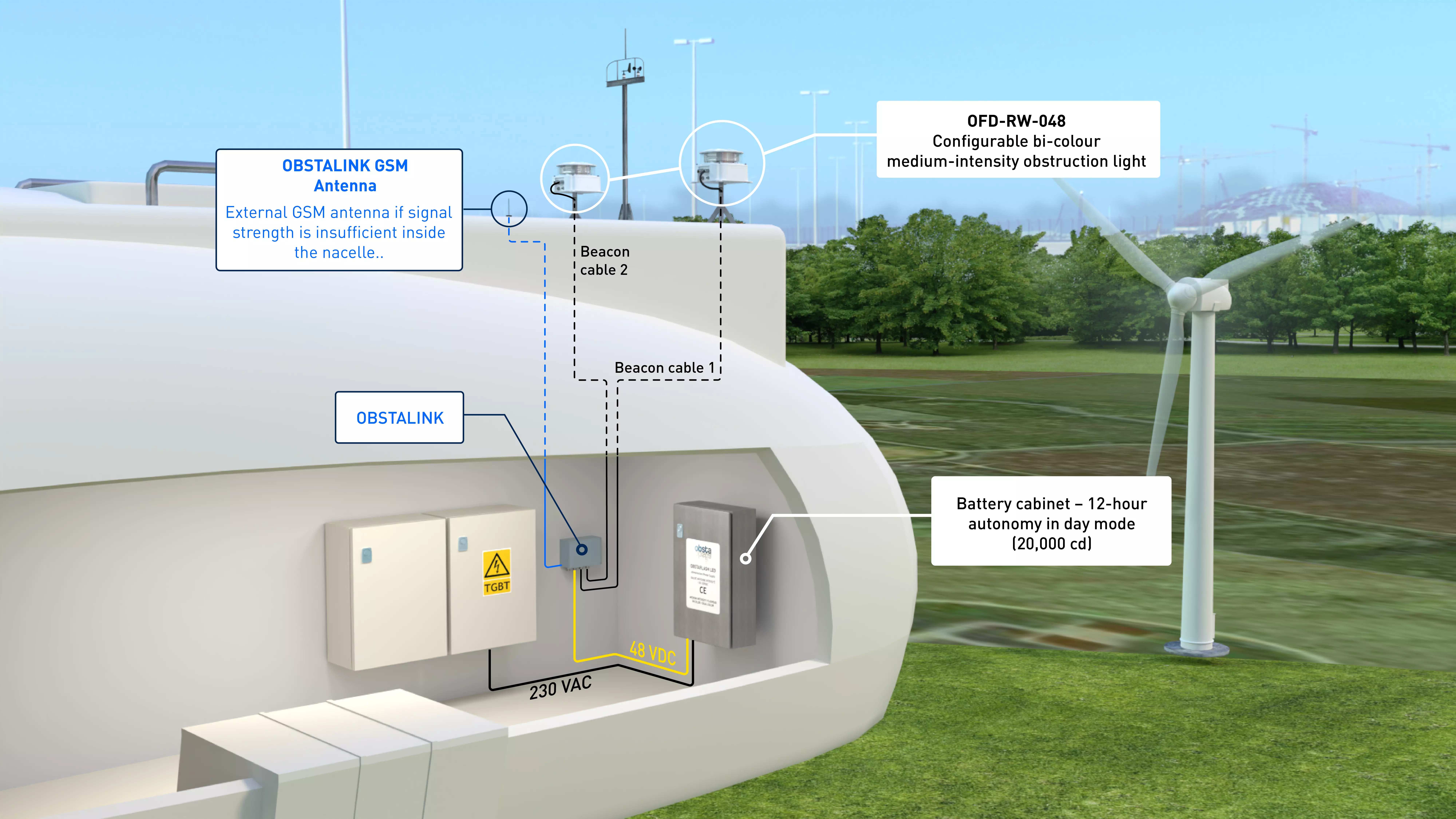 ICAO WIND TURBINE LIGHTING These recommendations are based on Chapter 6 of Annex 14 of ICAO (International Civil Aviation Organization latest edition) and are given for information only ICAO red medium intensity (night only operation) or dual color medium intensity (day and night operation): Autonomous flash-heads with automatic wireless synchronisation In option an IoT controller (SIM card provided) and 48Vdc UPS with 12 hours back-up in option Position DescriptionModel 1 Red medium intensity (night only)OFC-RI-048 2 Dual color medium intensityOFD-RW-048 3 In option in the nacelle 3 IOT gateway for remote controlOBSTALINK 3 48Vdc UPS with battery back-up (110 to 240Vac power supply)48V-BAT-18AH